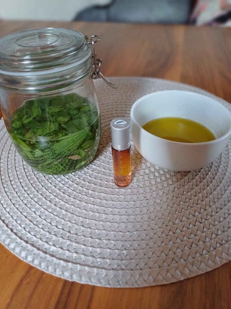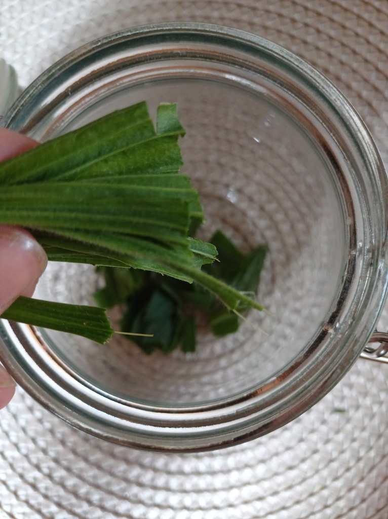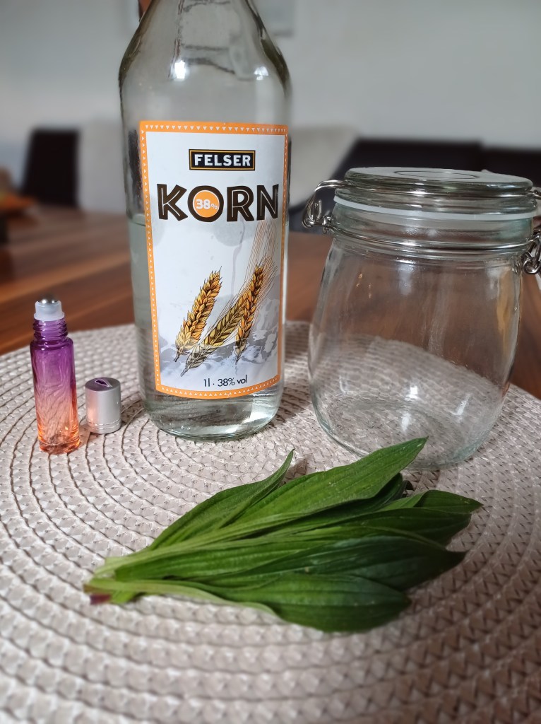 Dafür brauchen wir frische Blätter vom Spitzwegerich, 38% Korn, ein großes Glas mit Deckel, kleine Roll-On Flaschen und etwas Olivenöl.