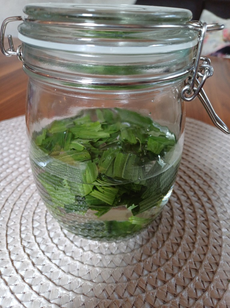 Unsere angesetzte Tinktur stellen wir für 3-4 Wochen an einen kühlen und dunklen Platz bis alle guten Helferlein in den Alkohol gewandert sind.