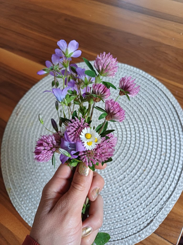 Dafür müsst ihr nur nach draußen und ein paar essbare Blumen sammeln. Ich habe Gänseblümchen, Rotklee und den Wiesen-Storchenschnabel gepflückt.