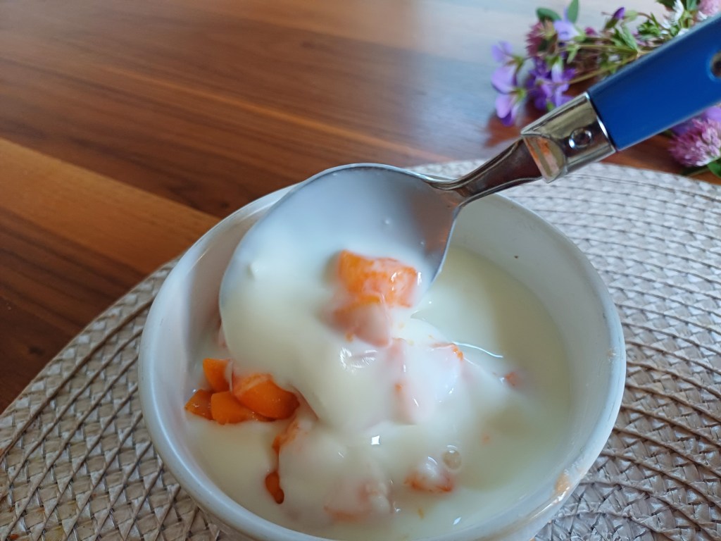 Wir beginnen damit, die Früchte zu schneiden, (ich habe frische Marillen genommen) und geben sie in unser Joghurt.