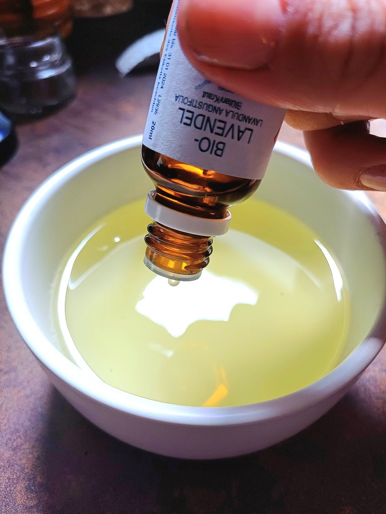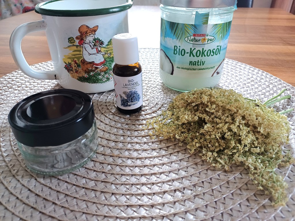 Dafür benötigen wir nur Hollerblüten und Kokosöl. Ich gebe gerne ein paar Tropfen ätherisches Lavendelöl dazu, das ist aber optional.