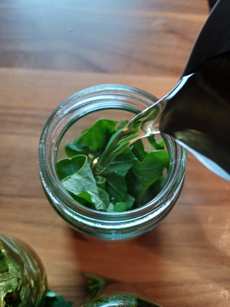 Danach füllen wir die Gläser zu je zwei Drittel mit den Pflanzenteilen.