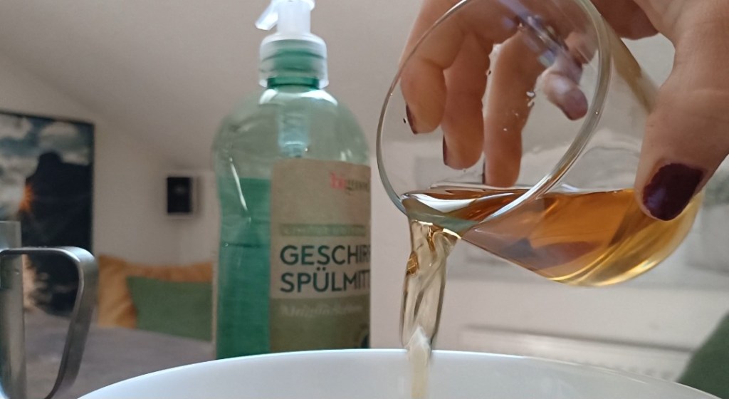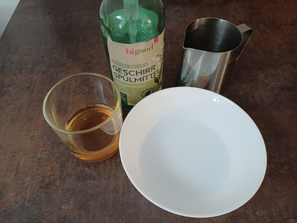 Zum Schluss noch 3 Spritzer Spülmittel und umrühren. Durch das Spüli können die Fliegen nicht mehr heraus fliegen, weil die Oberflächenspannung durchbrochen wurde.