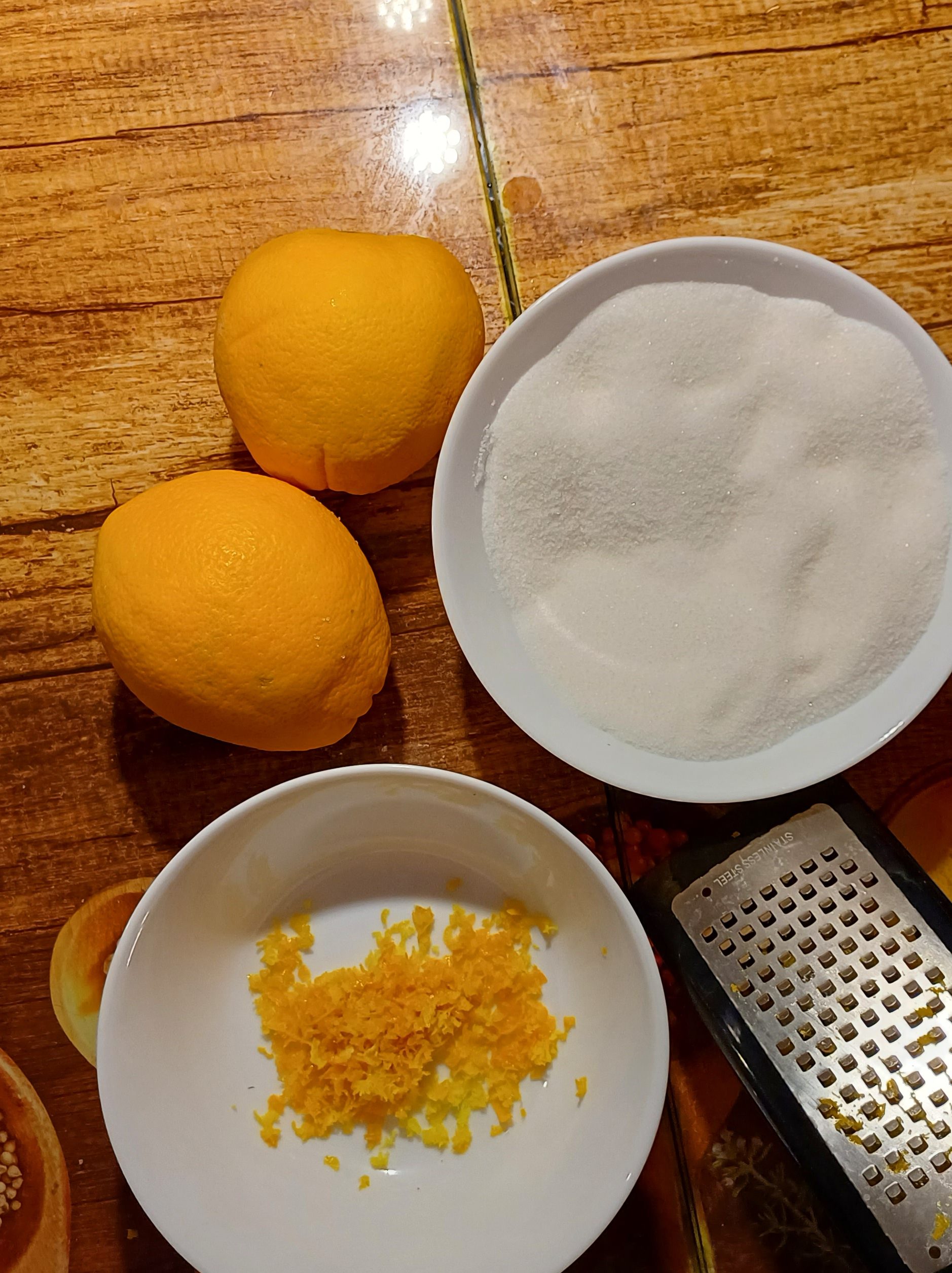 Für die Herstellung benötigen wir eine Reibe, die Schale von 3 Bio-Orangen, 8 Esslöffel Zucker und 2 Esslöffel getrocknete Melisse.
