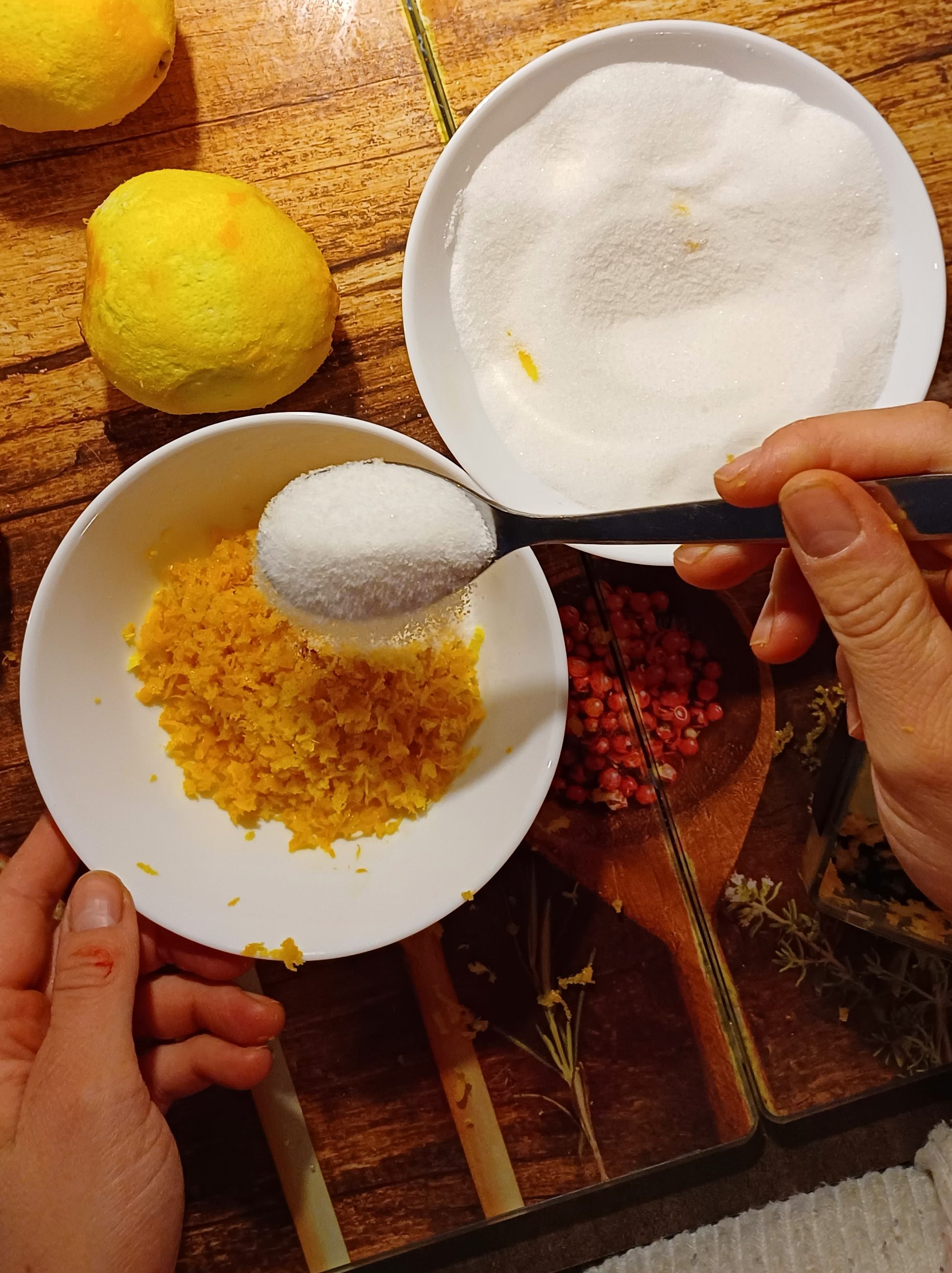 Danach mischen wir den Zucker und die geriebene Schale zusammen.