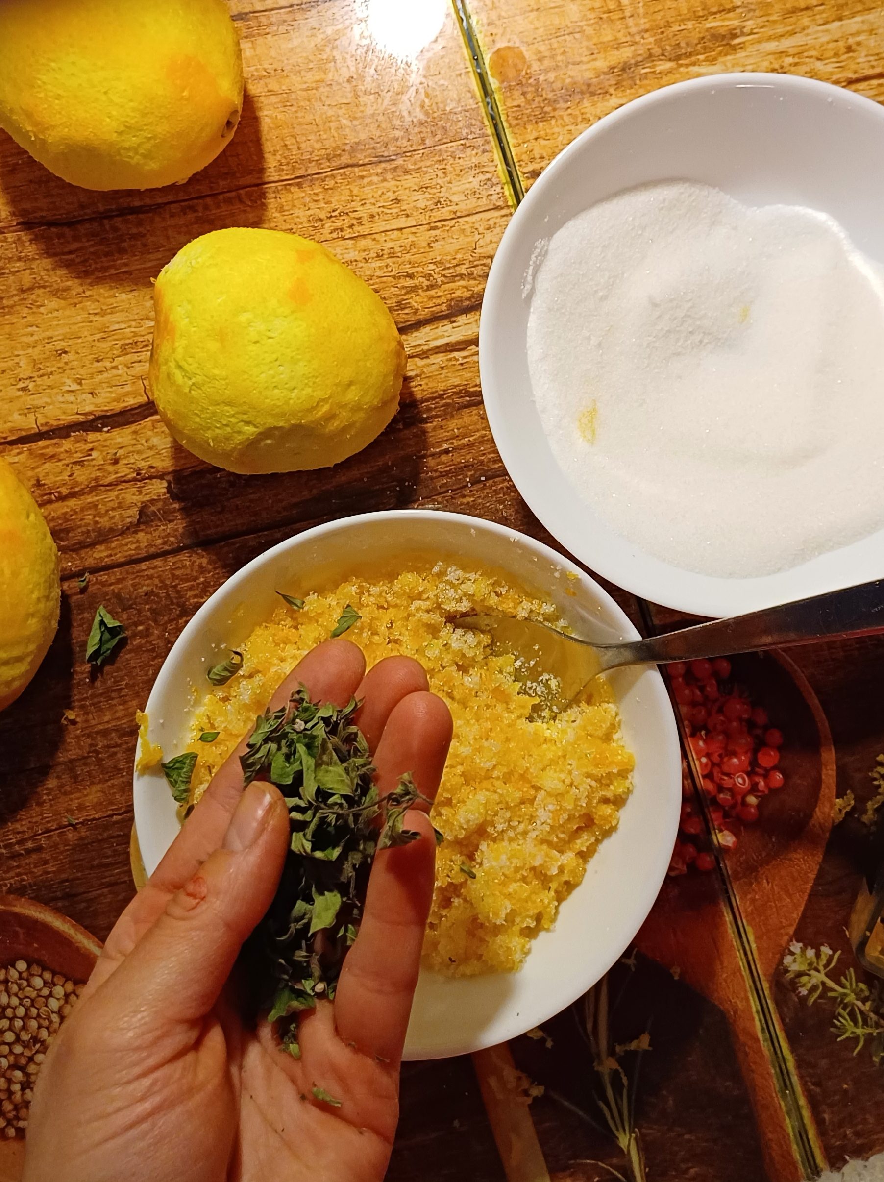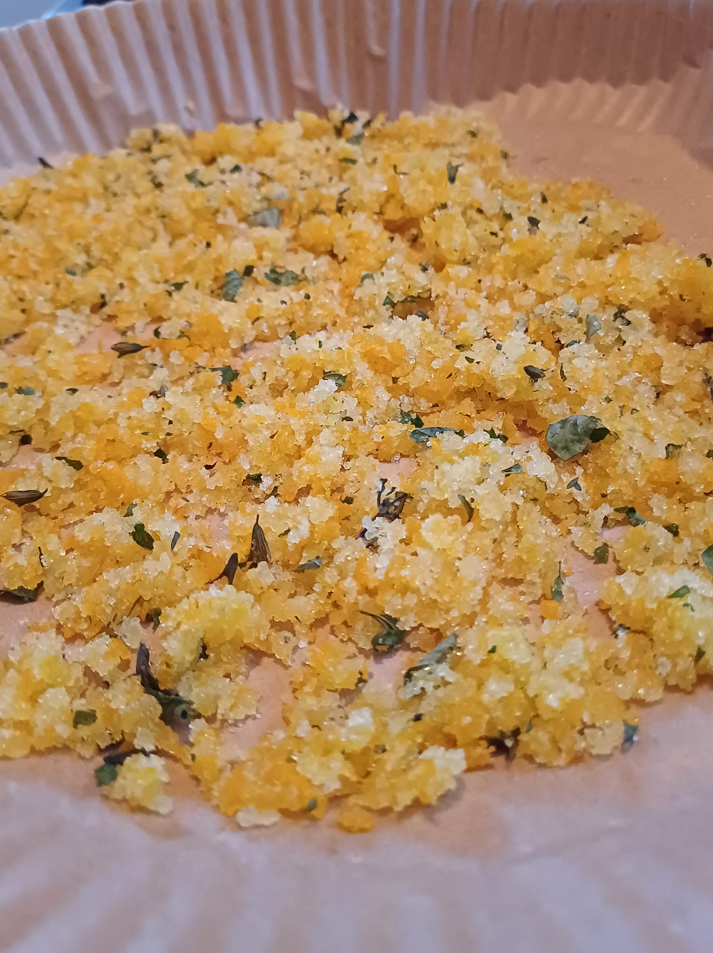 Wir machen einen Kräuterzucker mit Bio-Orangenschalen und getrockneter Melisse.
