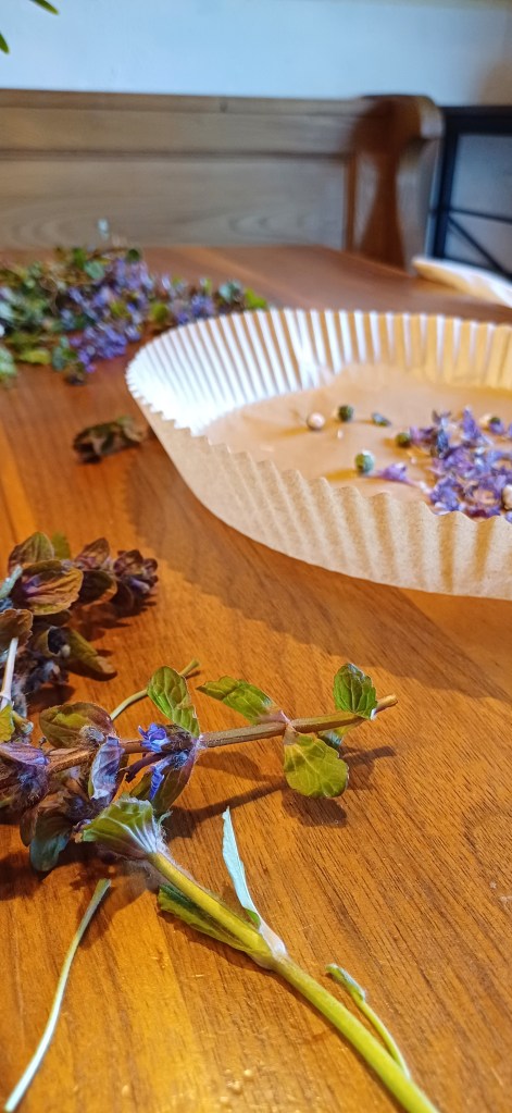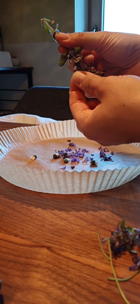 Die Blüten habe ich abgezupft und auf ein Backpapier gegeben.