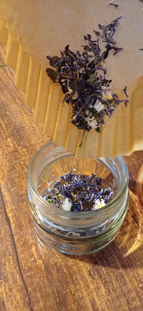Ich gebe sie in ein Schraubglas und lagere sie dunkel und kühl. So bleiben alle Inhaltsstoffe enthalten und auch die Farben verblassen nicht so schnell.