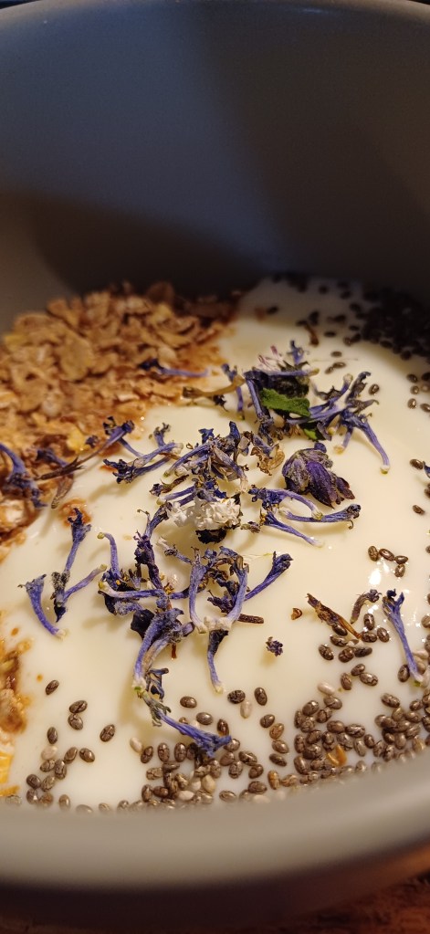 Wenn ihr wollt, könnt ihr euer Blüten-Topping noch verfeinern – zum Beispiel mit Rosinen, getrockneten Hagebutten, Chiasamen, Flohsamen – hier sind eurer Kreativität keine Grenzen gesetzt 🩷